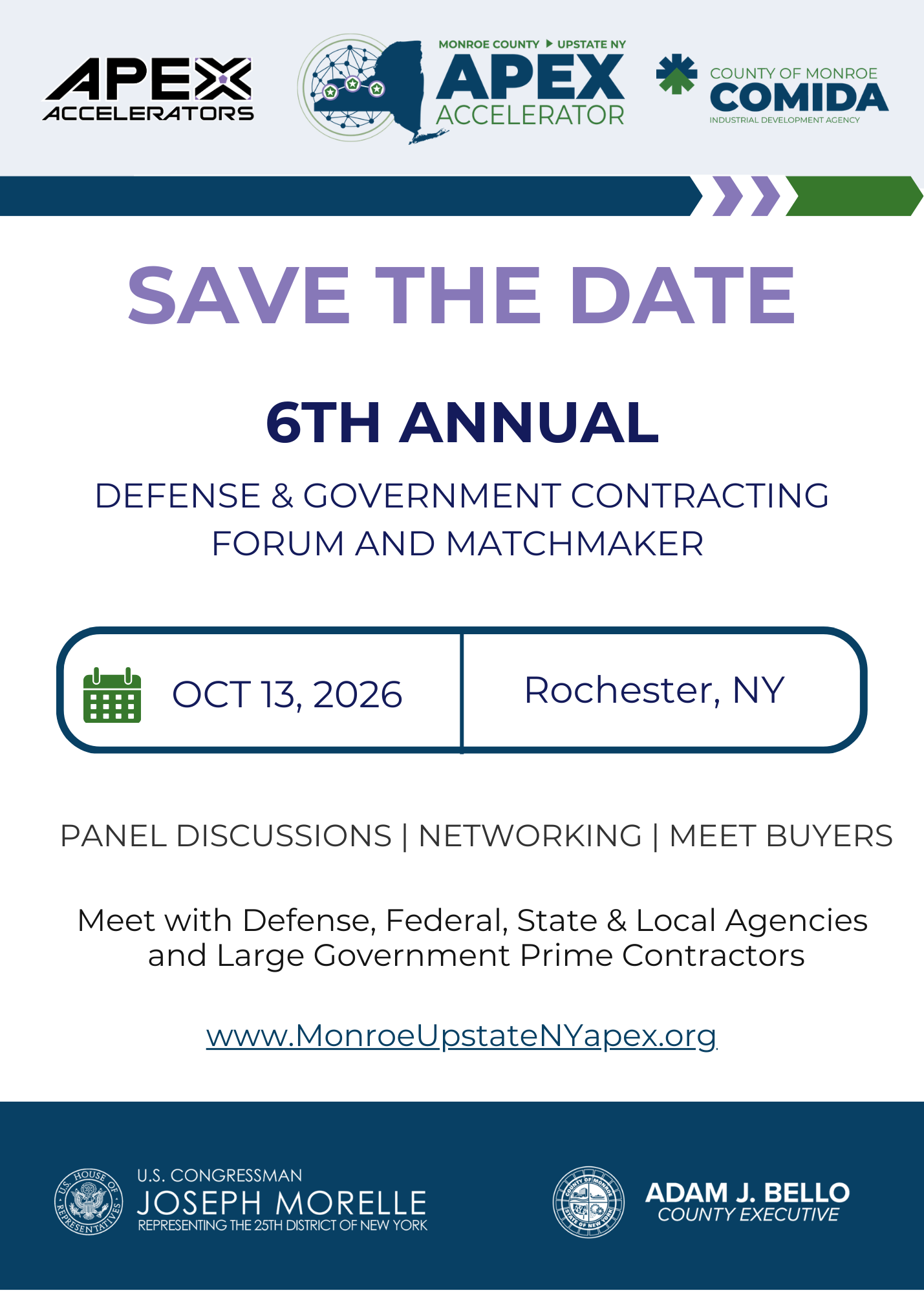 Back to All Events 6th Annual Defense & Government Contracting Forum and Matchmaker Tuesday, October 13, 2026 8:00 AM 5:00 PM Rochester, NY (map) Google Calendar ICS
